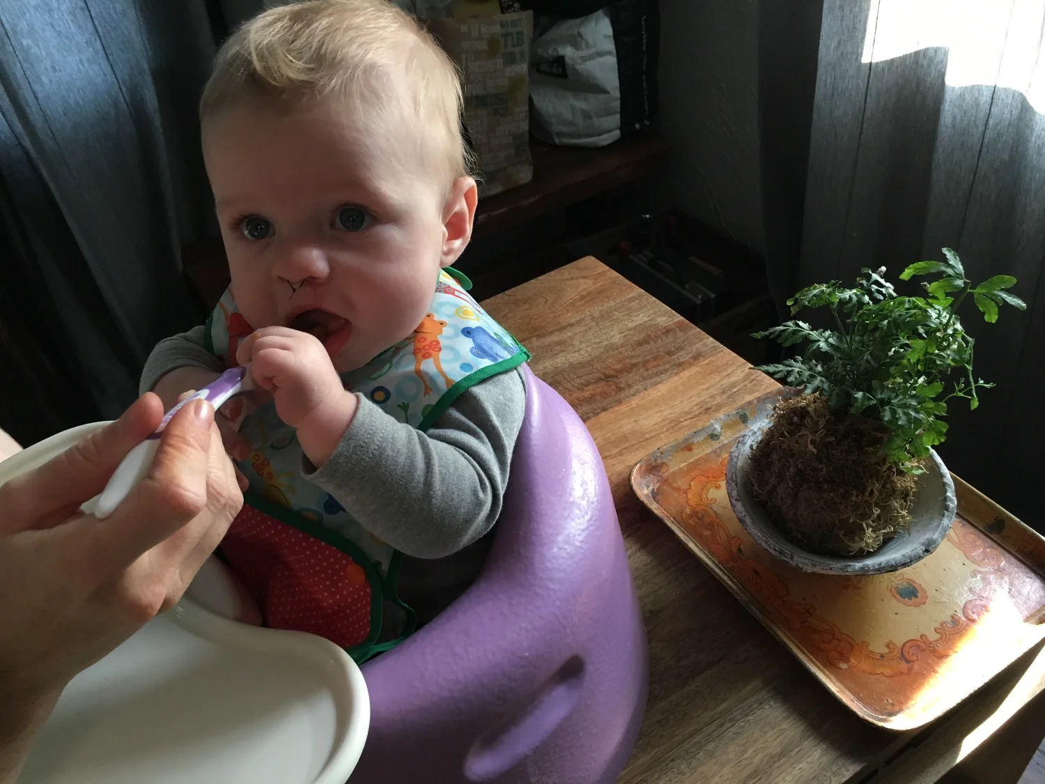 Speaking of gnawing, Finch is now "eating" solids. I use the term "eating" loosely because I'm honestly not sure how much food gets in the belly yet. But he seems to enjoy it. Kind of. He really liked his first meal of sweet potatoes, then since has not been a fan of purees. He loves gnawing on whole fruits and such, so that might be the way to go. Either way, it's a fun little activity to occupy ourselves in the sometimes long days. Putting a melon in a mesh bag and plopping him into the Bumbo is also a great way for mama to get some things done as it keeps him occupied as he works on sucking the fruit dry.